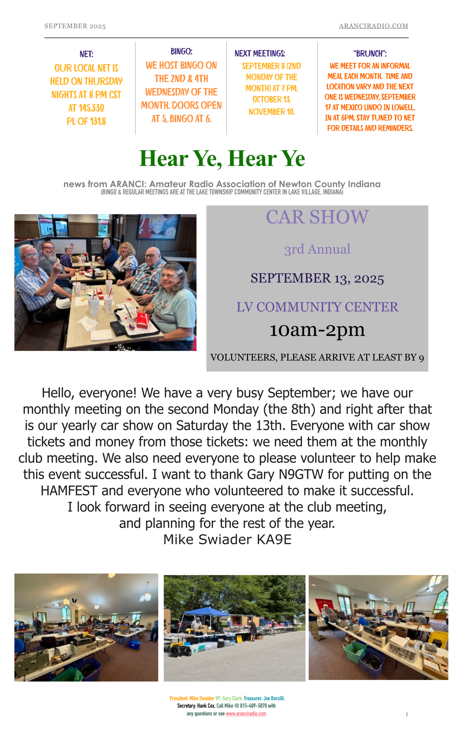 The Mission of the Amateur Radio Association of Newton County Indiana (ARANCI) is to recruit, train, and ​help committed Ham Radio operators carry on the tradition of amateur radio by using our network of technical resources and ​expertise to provide equipment, skilled ​operators and emergency services when ​called upon by local authorities in time of ​need to assist and protect the citizens in ​the communities in which we live and serve.  ARANCI is dedicated to community service ​and providing education to the public about the history, operation, ​functions and benefits of the Amateur ​Radio  Services.​